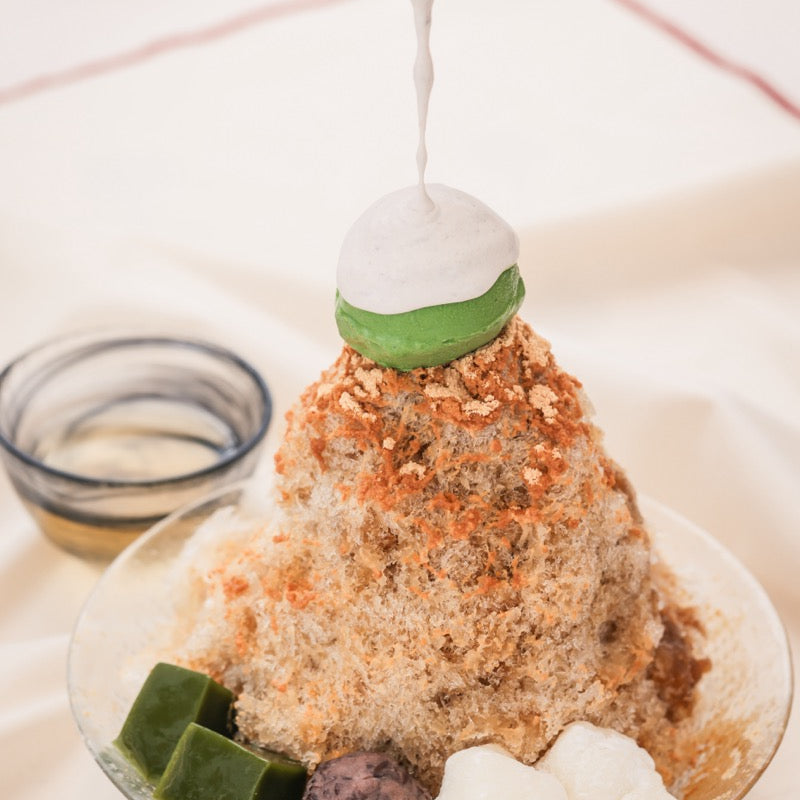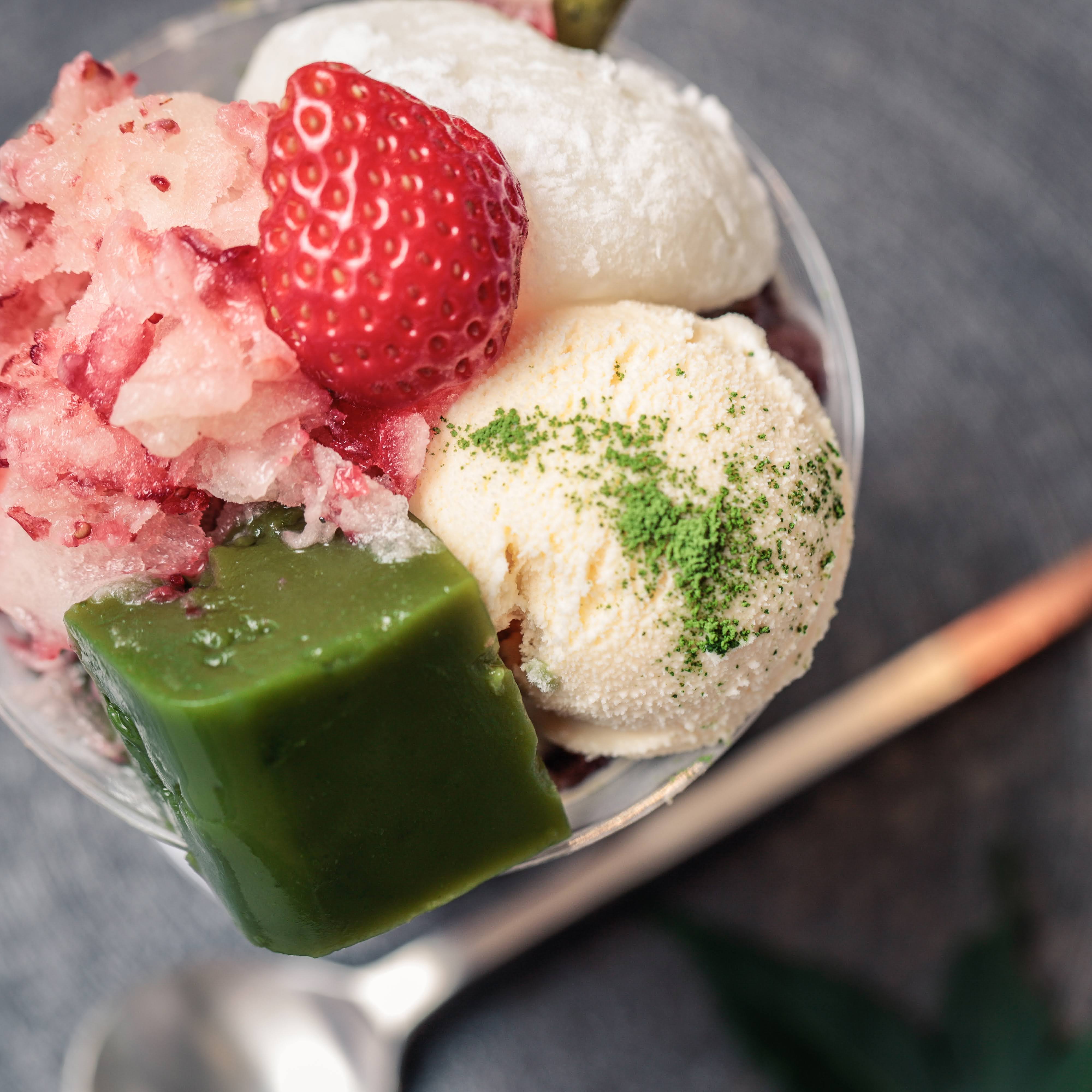 濃厚な出雲抹茶ジェラートに、沖縄の黒糖蜜を合わせた餅屋のあんみつ。