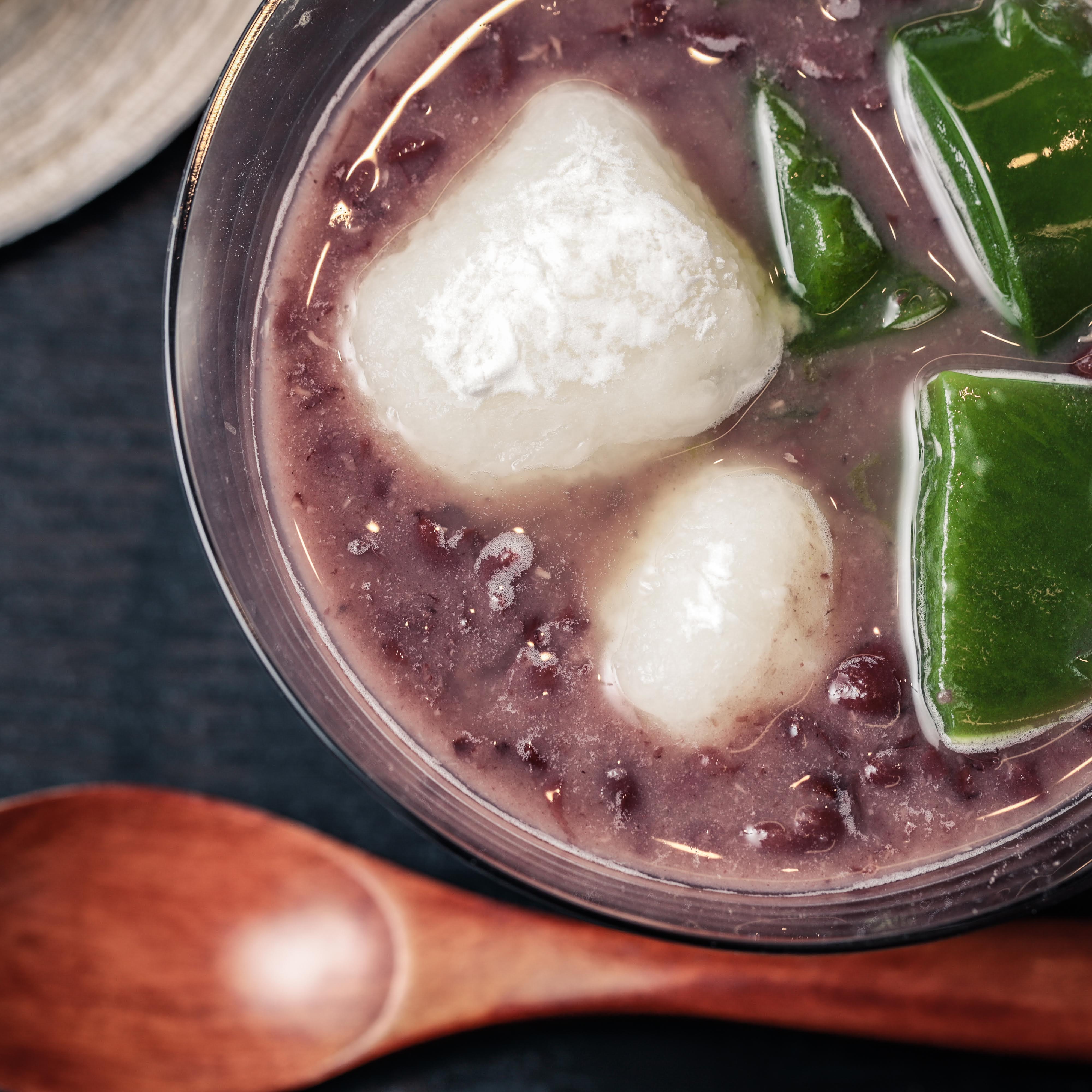 出雲抹茶の寒天に、あいと自慢のあずきとお餅をあわせました。