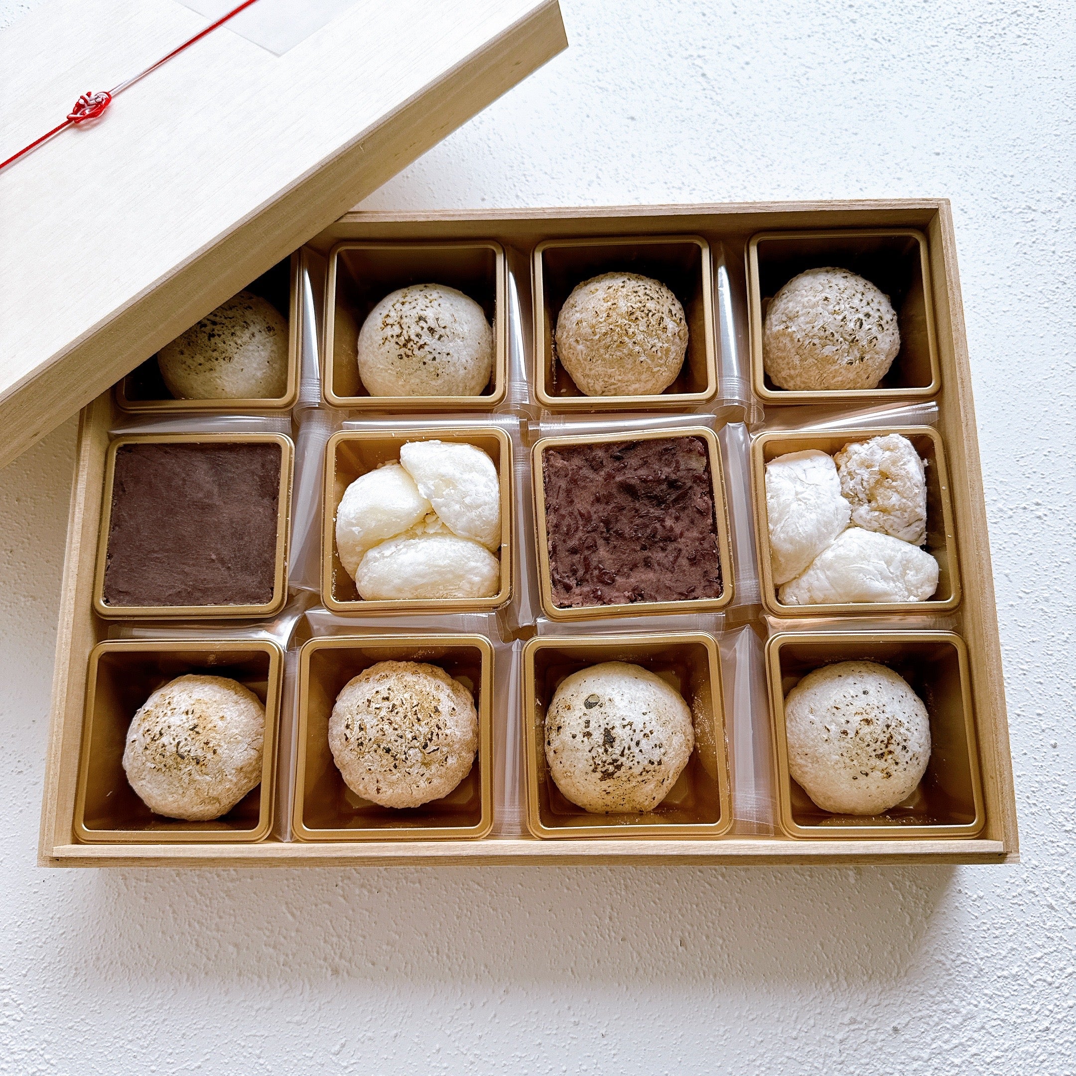 白の生大福と季節の生大福に、お汁粉とぜんざいがセットになった木箱入りの商品です。