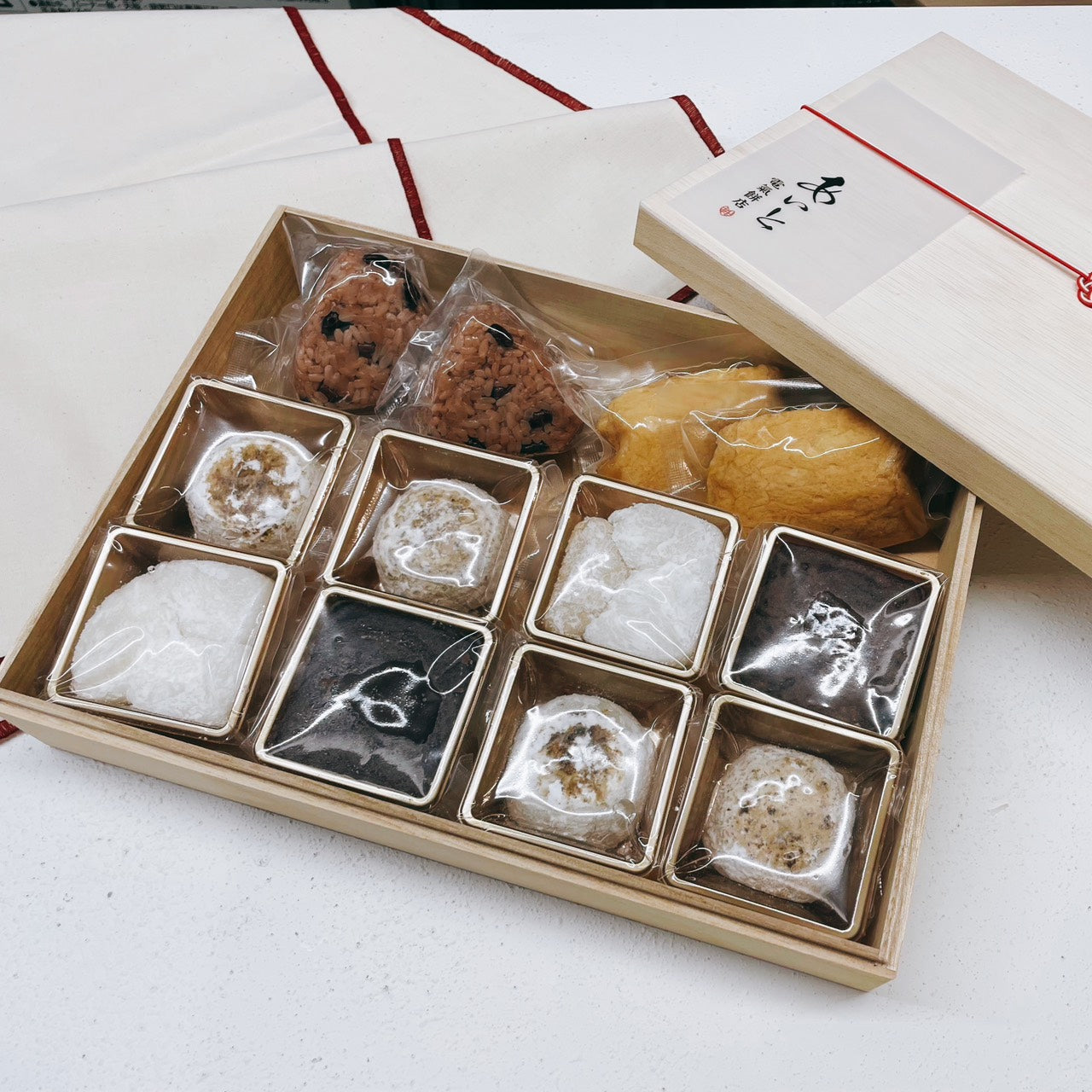 手間暇掛けて小豆で丁寧に作った御赤飯といなり餅に、香ばしい焼き大福。